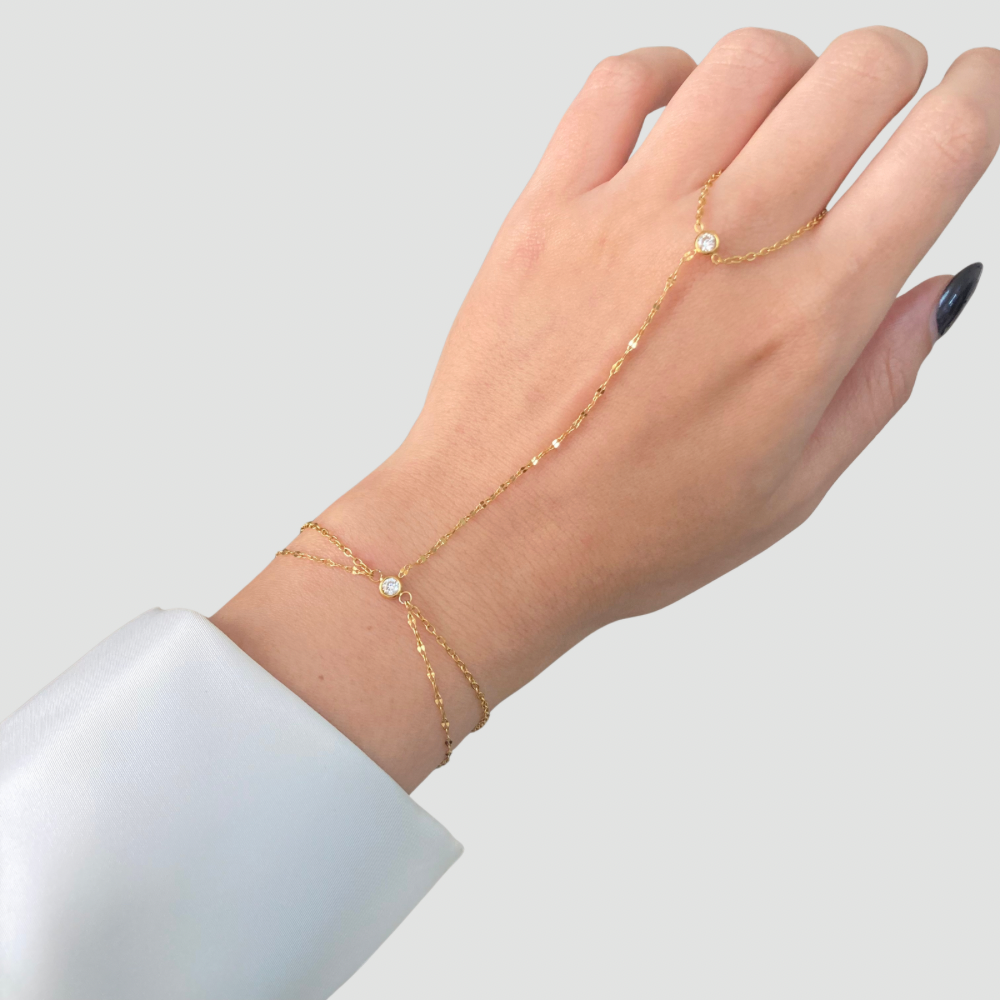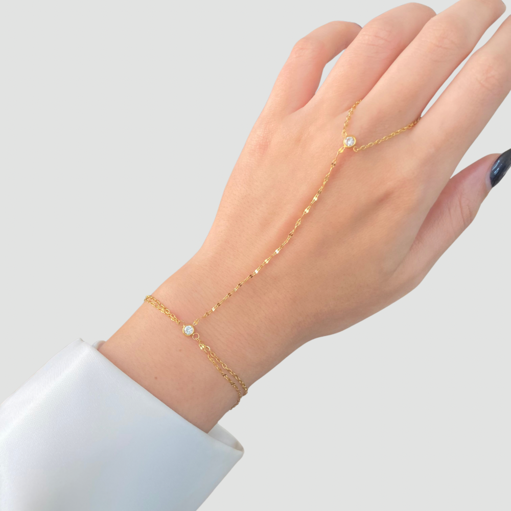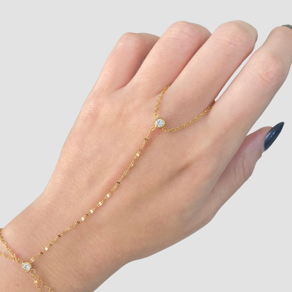 Crafted with precision, this hand chain features an 18K gold-plated finish that resists tarnishing and maintains its lustrous appearance. The waterproof construction ensures durability through daily wear, while the adjustable design 18 cm base with a 5 cm extension accommodates various wrist sizes for a customized fit.