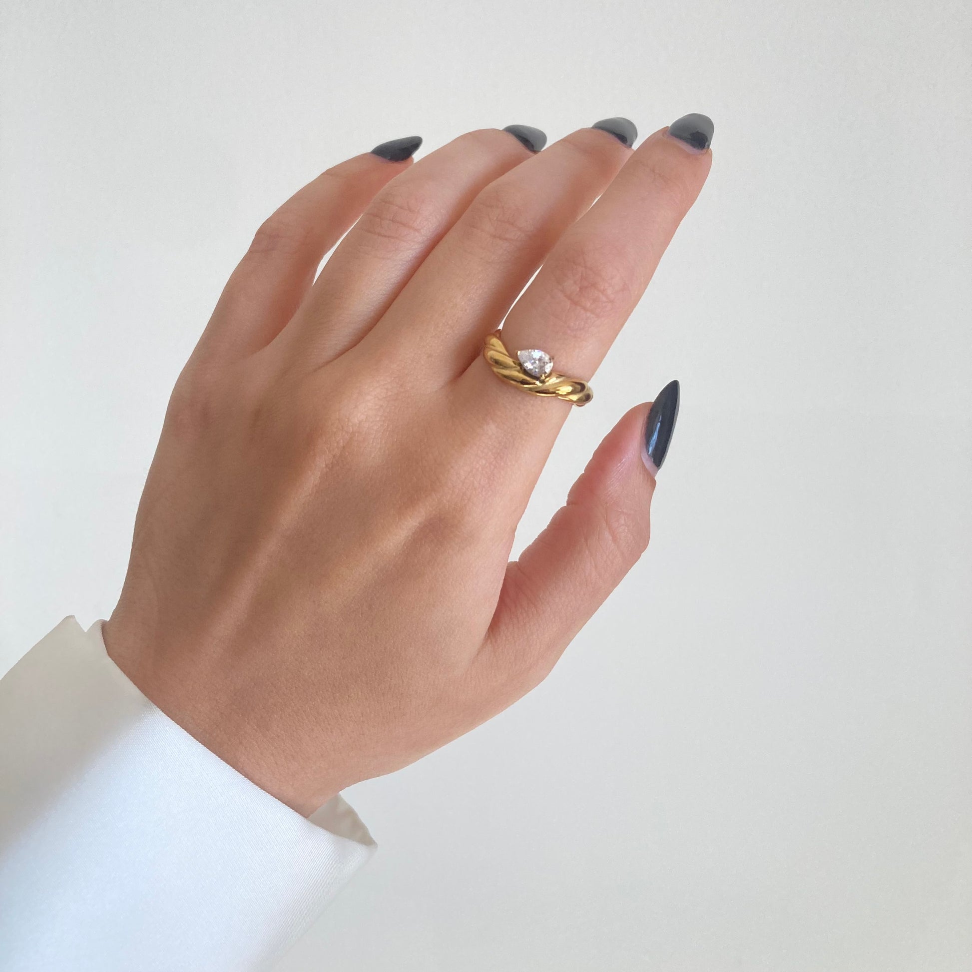 Sparkle without the worry! This pear-shaped twist ring features 18k gold plating over durable stainless steel—waterproof, tarnish-free, and ready for everyday wear.